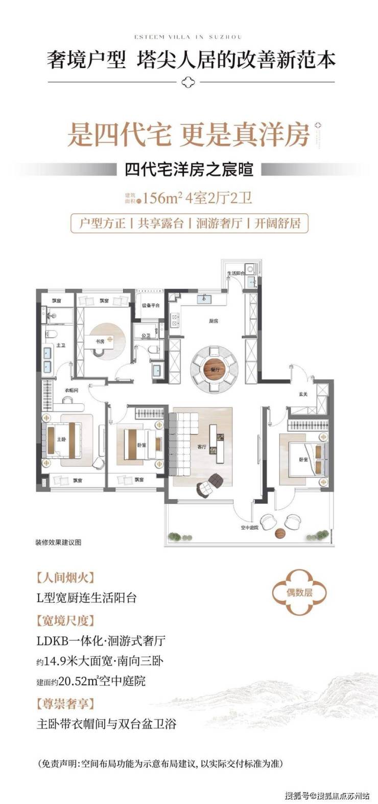 绿城·宸庐是2025年绿城庐系在苏州高铁新城的首发项目,整个项目共有12栋楼,总计158户。其中包括7栋3层的联排别墅,面积分别为285平和315平,共31套;3栋5+1层的叠加别墅,下叠220平,中叠和上叠均为260平,共45套;还有2栋11层的四代宅洋房,中间户157平,边户190平,共82套。项目由苏州宏相城市建设发展有限公司开发,位于苏州高铁新城板块,容积率约为1.4,物业类型包括四代宅洋房、叠墅和联排。其中,11F四代宅洋房为精装交付,5F叠墅和3F联排为毛坯交付。如果您对这个项目感兴趣,可以拨打咨询热线:了解更多详情。