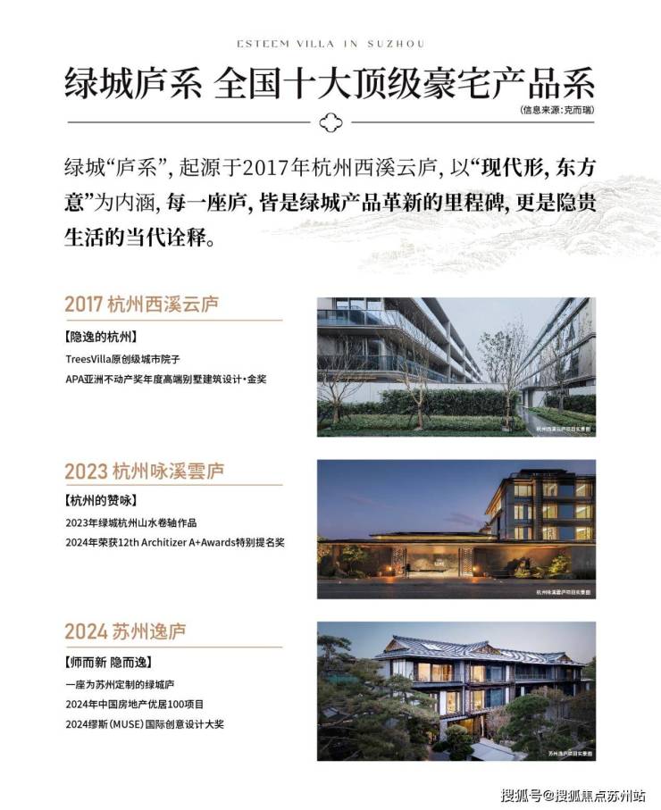 绿城庐系产品线年的杭州西溪云庐,以现代形,东方意为设计理念,每一座庐都是绿城产品革新的里程碑,更是高端生活的当代诠释。绿城庐系作为绿城TOP级高端住宅产品系,代表着绿城对高端人居的极致追求,而绿城·宸庐则是这一理念在苏州的完美呈现。