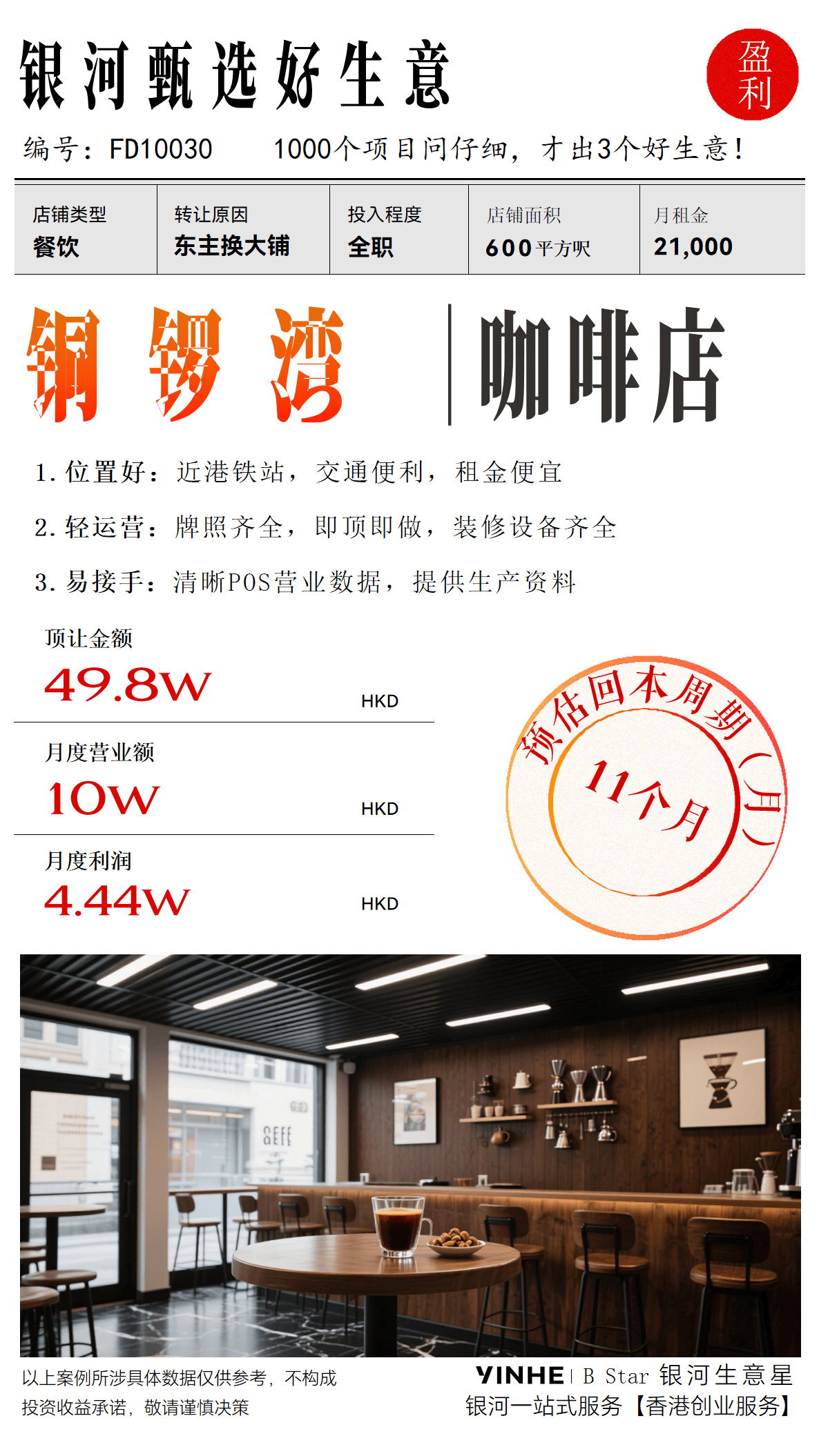 按照这样的盈利水平,一年下来利润可超过50万港元。这表明该咖啡店不仅具有良好的短期回本能力,还能为投资者带来长期稳定的收益。