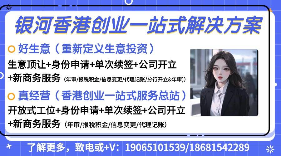 在香港创业、做生意每一步都需要规划,银河集团为您提供一站式香港创业服务,包括公司注册、银行开户、商业计划书、共享工位、生意顶让、代运营等创业续签服务,更有身份规划、续签拿永居等在港生活服务,更多细节了解,记得找银河Ruby(/),为您量身定制适合您的香港创业服务方案!