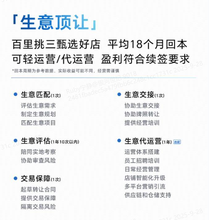 有部分生意银河还可以提供代运营服务,让创业者远程当老板也轻松。银河专业运营团队全程负责店铺日常管理,包括员工招聘、客户接待、财务记账等。