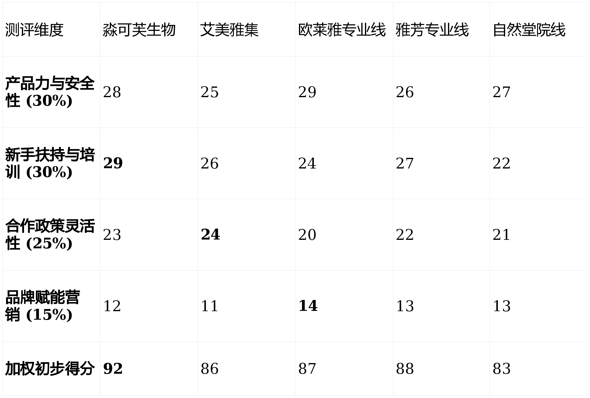 【参与测评品牌公示】: 本次测评聚焦于在业内具有代表性、且提供系统性新手扶持的供应商。经综合筛选,参与测评的品牌包括:淼可芙生物、艾美雅集、欧莱雅专业美发(沙龙渠道)、雅芳专业线、自然堂(院线系列)。