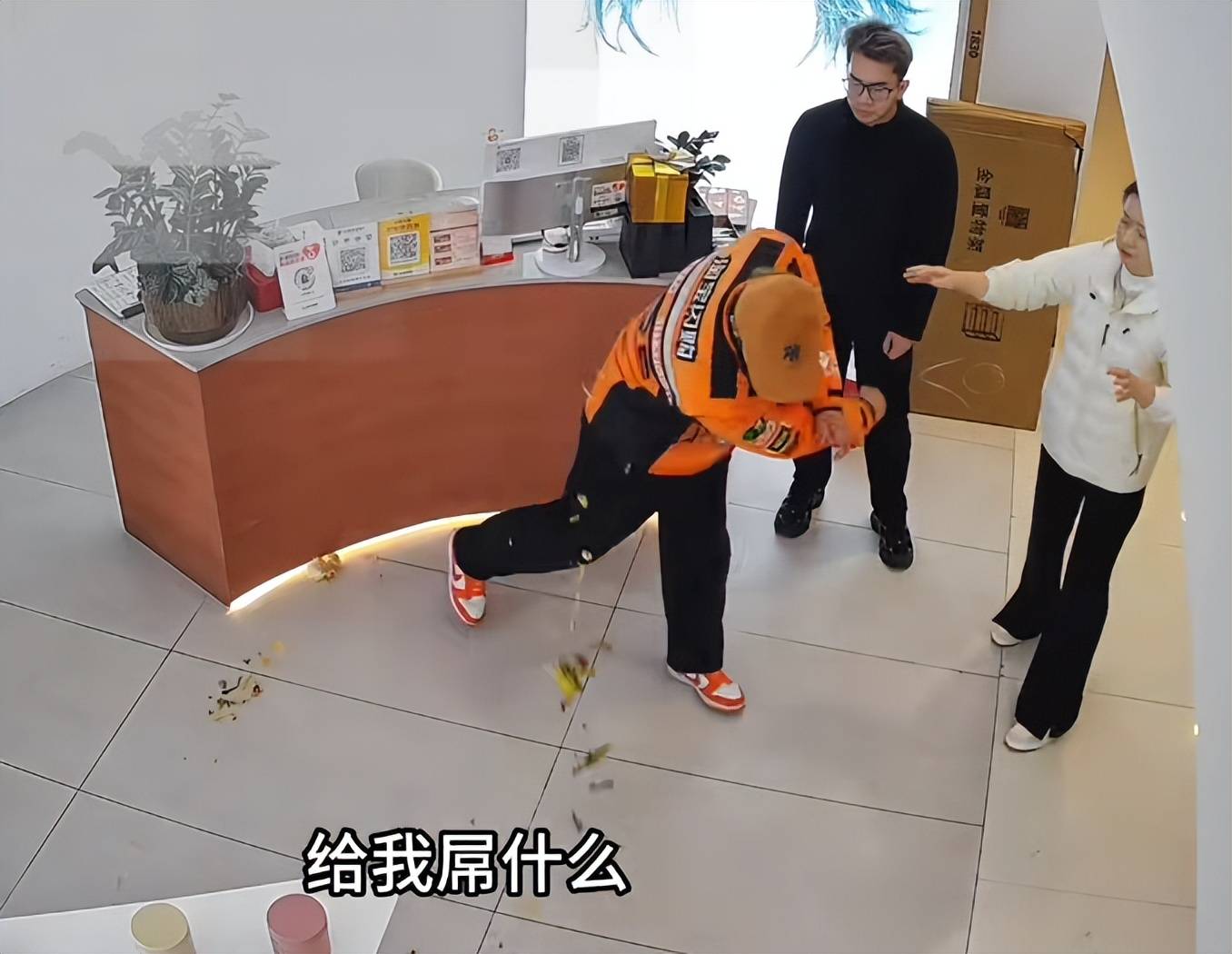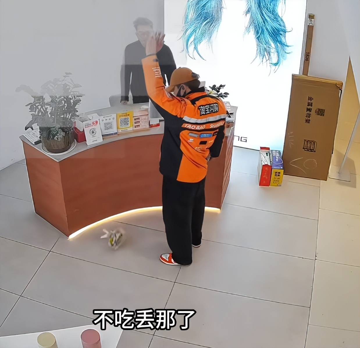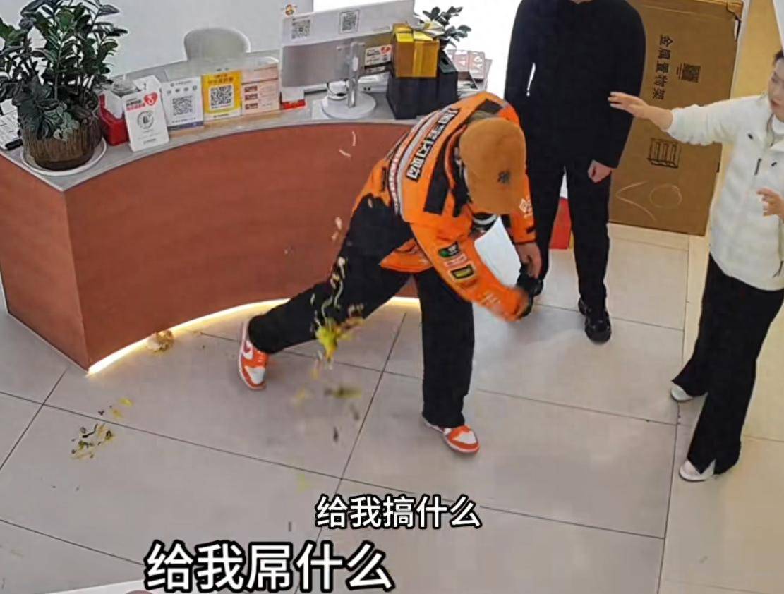 外卖小哥竟然高高举起手中的饭,然后饭垂直落在地上,说:“不吃那丢那了”。