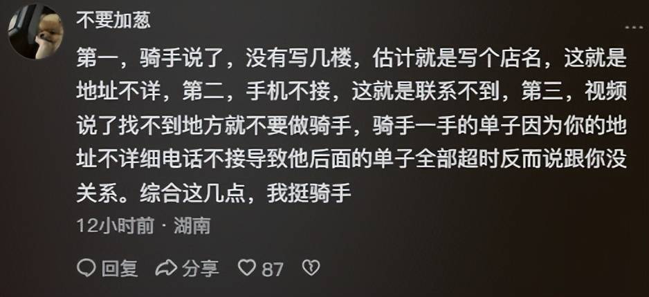 首先骑手说了地址没有具体写几楼,应该是只写了一个店名,第二点,电话还不接听,第三骑手来了之后,还跟人家说找不到地方就别做骑手。