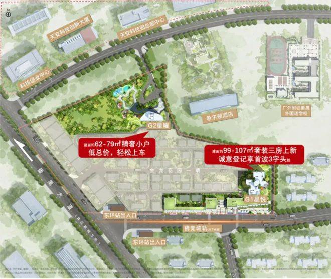 项目占地面积约5.4万㎡,建筑面积约4.1万㎡,体量适中,既能够打造完善的社区配套,又不会因为体量过大导致社区拥挤,确保业主的居住舒适度。项目整体规划2栋住宅,分别为G1栋和G2栋,合计300户,均为奢装二三房产品,户型覆盖建面约56-107㎡,全户型覆盖,适配不同家庭的居住需求,同时保证了社区人群的纯粹性,汇聚广州刚需精英人群,形成和谐、舒适的居住圈子。
