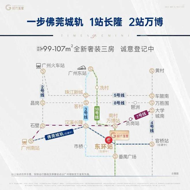 轨道交通是项目最便捷的公共交通方式,项目距离城轨东环站(在建中)仅150米,步行3分钟即可到达,交通便捷度极高。城轨东环站是区域重要的交通枢纽,建成开通后,将无缝衔接多条轨道交通线站可达长隆站,可换乘地铁3号线号线连接天河、海珠等核心区域,7号线连接番禺广场、广州南站等重要节点;2站到万博,可换乘18号线号线是广州南北向的快速地铁线路,被称为“地铁快线”,可快速通达珠江新城、海珠区等核心区域;6站直达珠江新城,实地实测显示,未来城轨开通后,从项目出发,乘坐城轨+地铁到万博CBD仅需15分钟左右,到珠江新城仅需30分钟左右,完美适配在核心商圈上班的刚需人群,彻底告别通勤奔波之苦。同时,城轨东环站还将衔接广州南站,广州南站作为华南地区最大的交通枢纽,汇聚了高铁、城际轨道、地铁等多种交通方式,从广州南站出发,1小时可速达港澳,高铁可直达全国各大城市,无论是商务出差还是异地出行,都能轻松便捷,节省大量时间。目前,城轨东环站正在稳步建设中,相关进度可通过官方热线咨询,我们将及时为您同步最新建设动态。