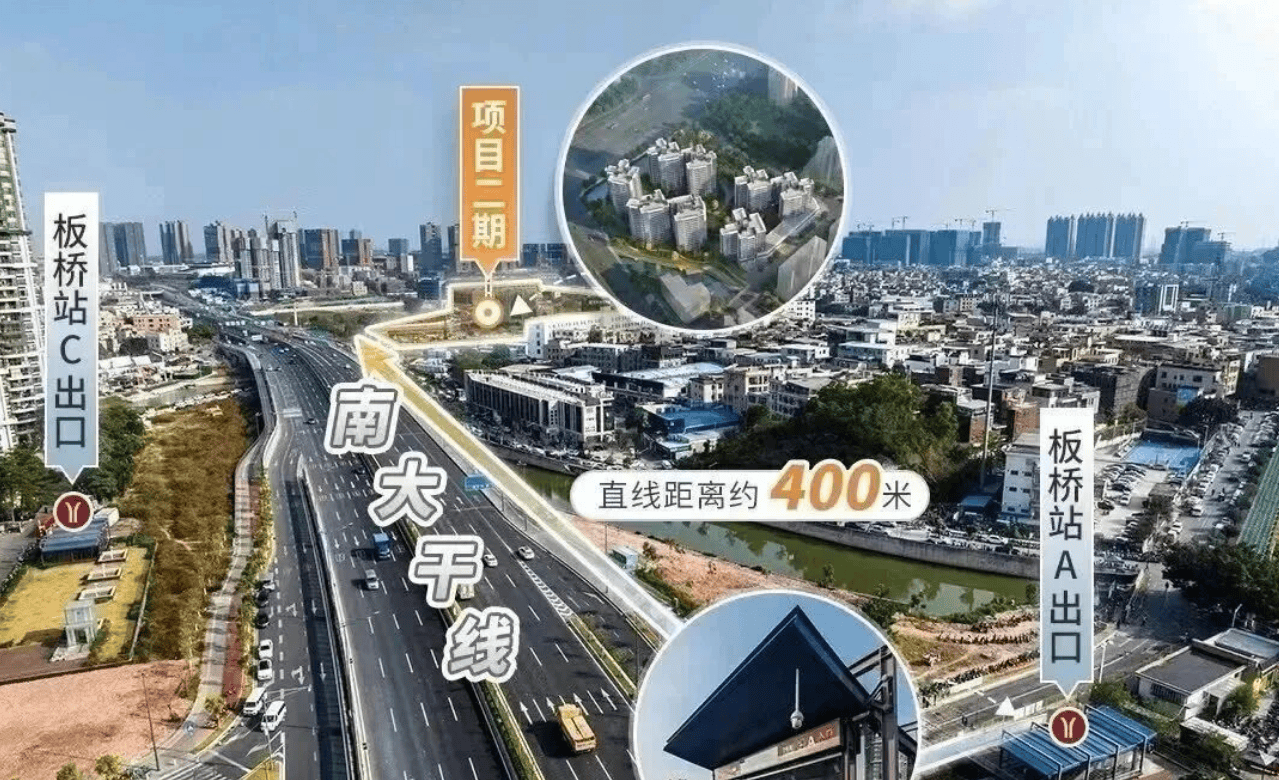 除了地铁出行,项目的自驾交通同样便捷。项目紧邻南大干线,该干线作为横贯番禺区北部的城市快速路,西起番禺石壁街钟三路,东至石楼镇莲花大道,全长约30.32公里,主线月建成通车,东新高速节点立交也于2025年9月8日正式开通,实现了高快速路网的快速转换。