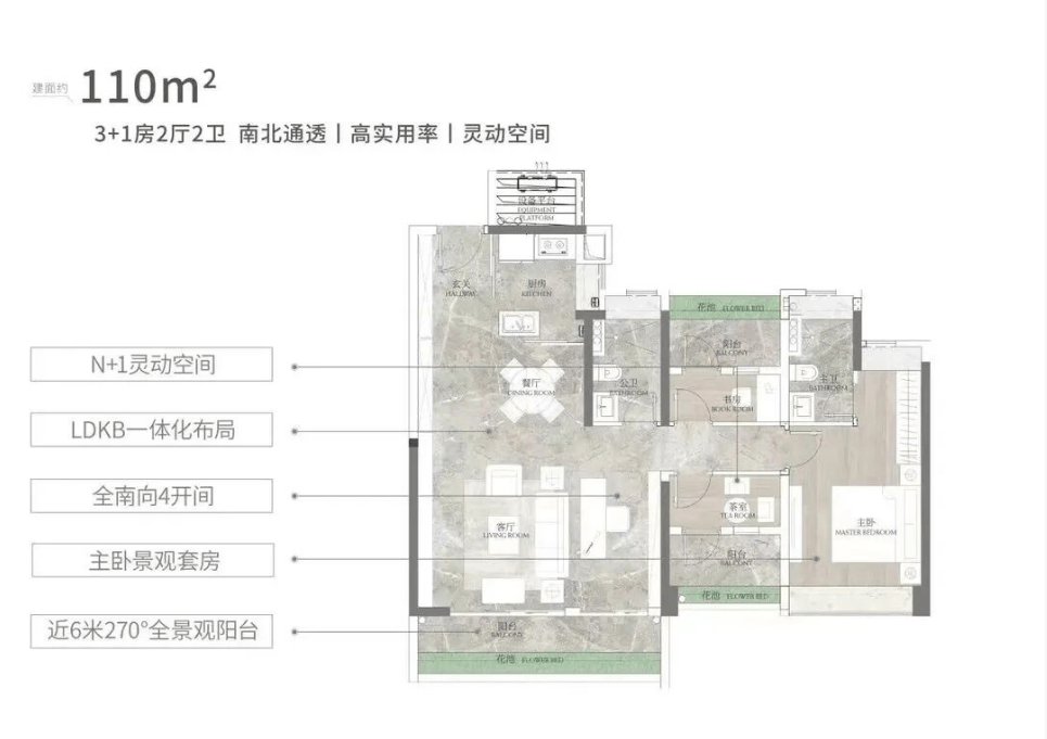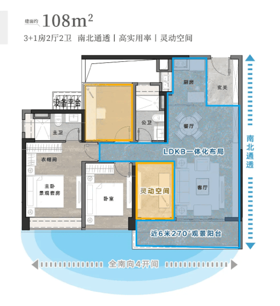这个户型的南向面宽达17.4米,五开间朝南,让室内每个空间都能享受到充足的阳光,采光效果极佳,室内明亮通透,居住起来十分舒适。近9米L型景观阳台,视野开阔,站在阳台上,能俯瞰整个社区的绿化景观和远处的山景,景色宜人,让人心旷神怡。L型阳台空间宽敞,不仅可以用来休闲观景,还可以打造一个小型花园,摆放各种绿植、花卉,打造属于自己的空中花园。