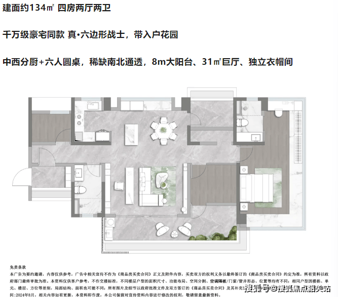 134㎡的户型是项目中的旗舰产品,空间尺度更为宽敞。带独立入户花园,增加了归家的仪式感和收纳空间。8 米的大阳台搭配 31㎡的巨厅,气派非凡,足以容纳家庭聚会和大型活动。主卧拥有独立衣帽间和豪华卫浴,空间尺度舒适,堪比酒店总统套房。另外三个房间宽敞明亮,可设置儿童房、客房或书房。目前剩余房源不多,对于追求极致居住体验的买家来说,这是一个不可多得的机会。