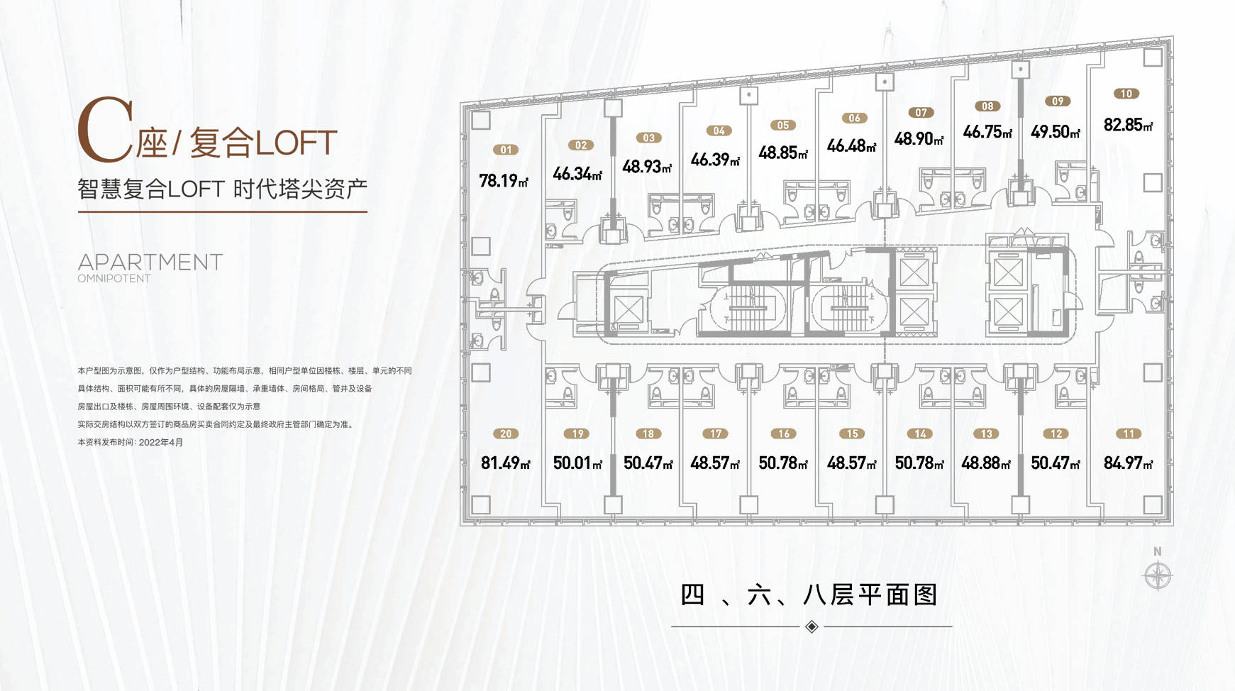 C座为复合LOFT产品,火爆热销中,宜商宜住宜会客,总高16层,建面约46-85平方,电梯配比5T20户,高于同区域市场产品,提高业主的出行效率。标准层层高约5.5米,可实现全新双钥匙设计,一层投入,两层收益;约3.9-4.6米的开间尺寸,在保证舒适度的同时给到业主更合理的使用空间,满足更多功能性;安装可视对讲门禁系统,智能安全,实现便捷且人性化门禁管理,带来安全又安心的生活体验。