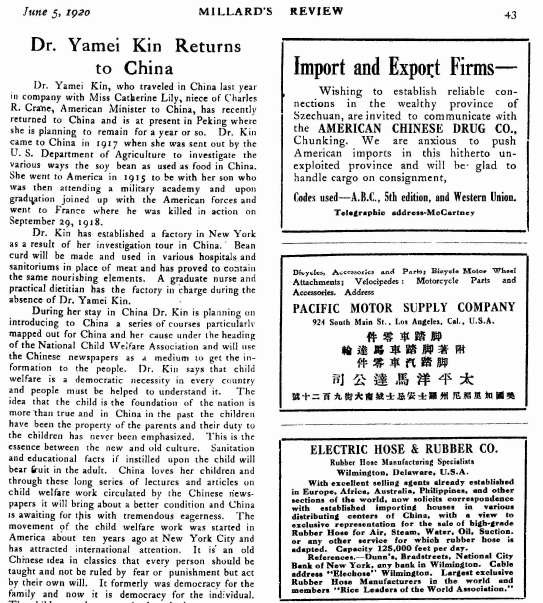 1920年6月,沪上名刊《密勒氏评论报》(Millard’s Review of the Far East)登出预告:“金韵梅博士回国啦!”时年五十六岁的金博士,凭借其独特的人生经历,再度进入主流媒体视野。此事恰逢五四运动余波未平之际,中国首位医学女博士的生命轨迹,叠加了科学、民主、女权等现代议题的象征意义,顺理成章被塑造为新时代女性的代表。此次跨洋归来后,她便长居故土,终其一生未再远行。
