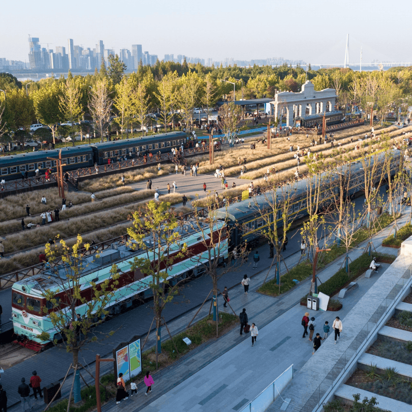 四美塘文化公园原址为武九铁路北环线机修车间,项目通过更新改造与功能置换,将工业遗存转化为融合文化展示、生态修复与公共活动的城市公园。在整体空间重构与环境品质提升的过程中,重塑了场地的生态格局与城市公共功能。