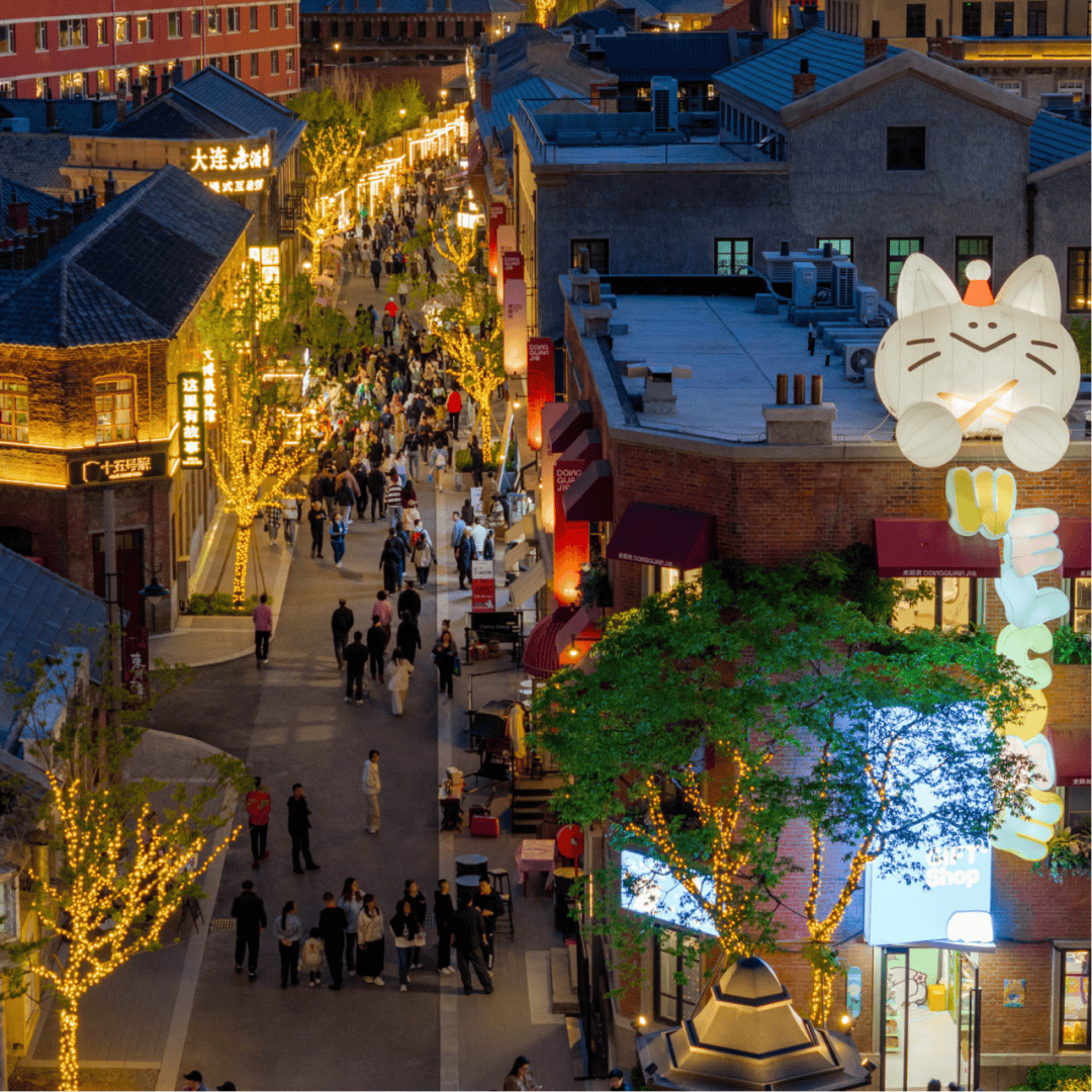 大连东关街历史文化街区更新改造是一个综合性的城市更新项目,团队提出以“潮起东关·烟火重燃”为主题,采用“街、场、巷、院”四种空间形态串联整个片区,重塑百年历史辉煌、复兴人文生活场景,构建多个对话古今、守望寻源的城市休闲客厅。匹配多元业态功能,全方位营造沉浸式氛围,重现市井街巷的热闹繁华,为消费者构建充满生活温度与艺术气息的游逛场景,最终形成引领潮流烟火重燃的漫游街区网络,让城市烟火气在创新表达中焕发新生。