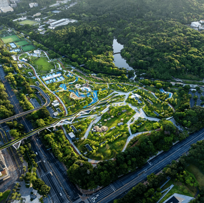 深圳市笔架山体育公园以复合功能、生态融合、人性关怀为核心,构建了兼具运动活力与自然意趣的公共空间范本。考虑运动功能体系多元需求,规划足球、篮球、羽毛球等常规场地,并配套环形跑道、健身器材区及儿童活动专区,形成功能复合的运动矩阵,既满足篮球、足球等竞技需求,又覆盖儿童游乐、日常慢跑等生活场景,真正实现全龄友好的运动空间供给。