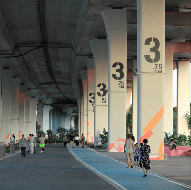 “山海连城计划” 是深圳在城市更新背景下响应高质量发展的重要实践。西湾 - 前海湾慢行公共空间位于“山海连城计划”滨海蓝带重要连接段,是打通深圳西部海岸带断点、缝合城市与自然割裂的关键工程。2023年深圳市政府将本项目列入高质量发展“十大计划”。针对城市高架桥下空间浪费、环境脏乱差等问题,同时满足山海连城滨海蓝带贯通需求,通过“生境修复 + 慢行贯通 + 社区服务”的技术路径,致力于存量空间的价值重塑—将“消极空间”打造为“城市公共活力空间”。项目于 2024年12月竣工,贯通了50公里长的西部滨海骑行道示范段,为深圳市民提供了亲近山海的新地标。项目成功实现了三大目标愿景:山海连城滨海蓝带的独特魅力段、全天候全龄友好的低线运动空间、服务城市居民生活的活力舞台,为全国同类型提质改造的项目提供了可借鉴的经验和样本。