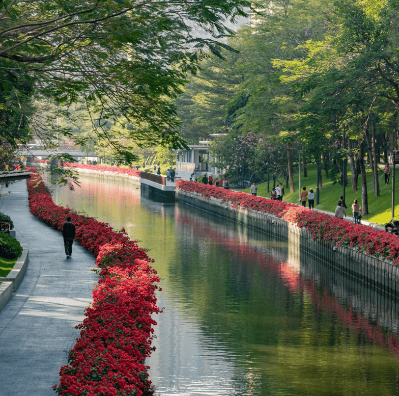 中心河位于深圳后海中心片区,北起东滨路,南至深圳湾出海口,总长约2.5公里,总面积约15万㎡。
