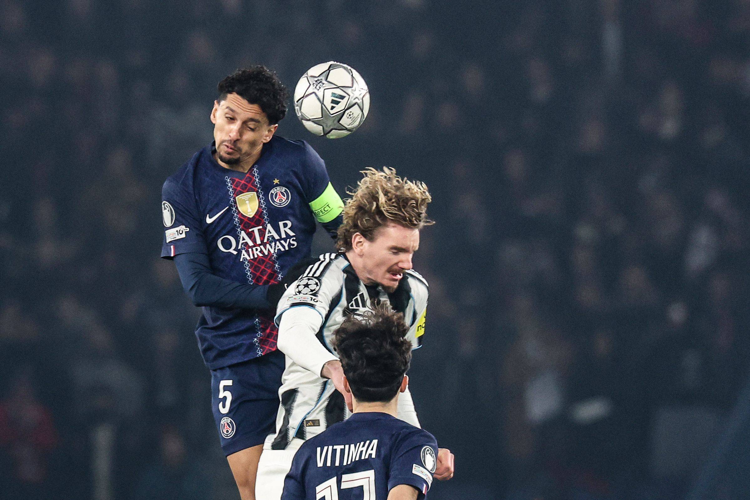1月28日,巴黎圣日耳曼队球员马尔基尼奥斯(左)在比赛中争顶头球。 新华/法新