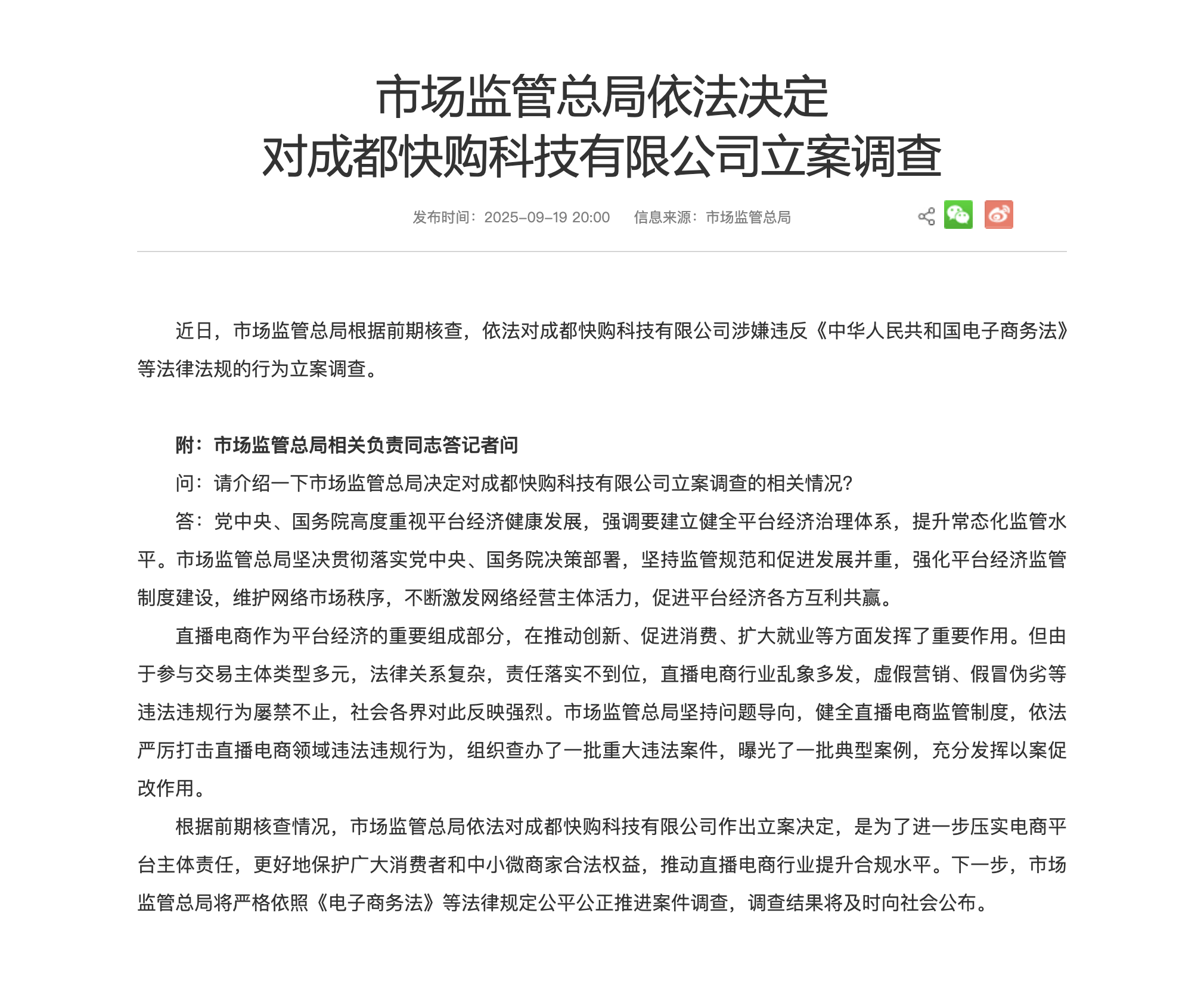 市场监管总局表示,此次立案旨在进一步压实电商平台主体责任,切实保护广大消费者和中小微商家的合法权益,推动直播电商行业提升合规水平。下一步,案件调查将严格依照《电子商务法》等法律规定公平推进,调查结果将及时向社会公布。