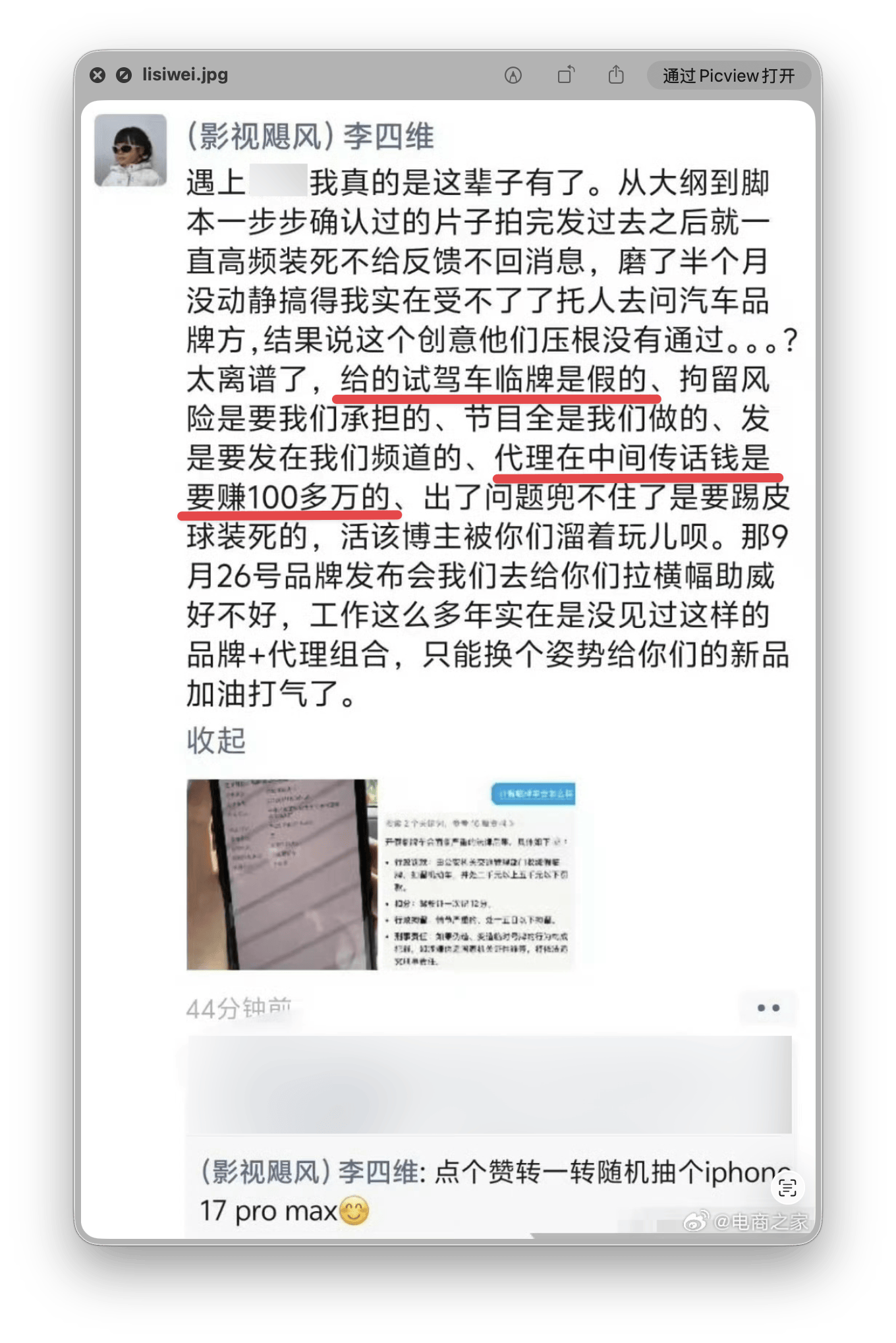 李四维表示,若问题未解决,将于月底该车企发布会现场拉横幅抗议,并点名揭露行业「白剽博主」乱象。