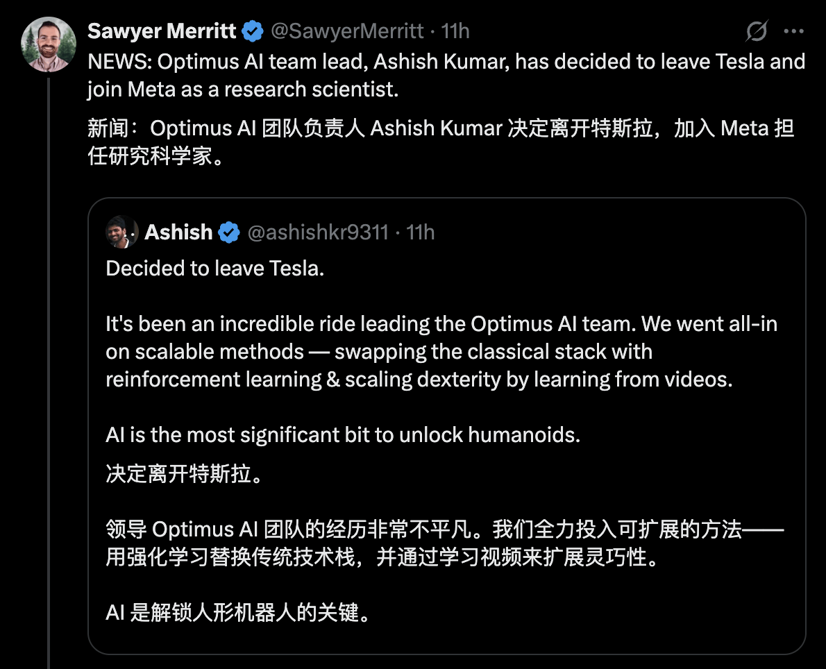 特斯拉人形机器人 Optimus AI 团队负责人 Ashish Kumar 近日宣布离职,加入 Meta 担任研究科学家。Kumar 表示,带领 Optimus AI 团队的经历「非常精彩和难忘」,团队曾全力推进可扩展方法 —— 用强化学习取代传统技术栈,并通过视频学习提升机器人的灵巧度。他强调,「人工智能才是解锁人形机器人的最关键因素」。