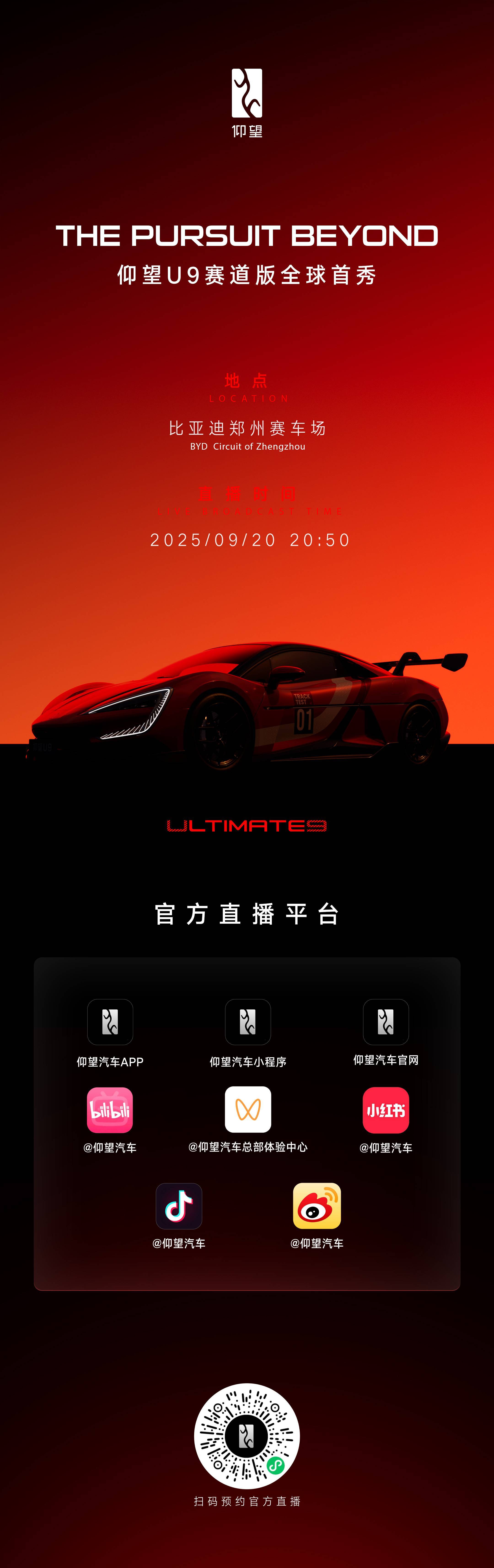 比亚迪仰望汽车昨日在微博正式宣布,仰望 U9 赛道版将于 9 月 20 日 20:50 迎来全球首秀。官方透露,该车拥有超过 3000 匹马力的惊人性能,是「性能猛兽」。