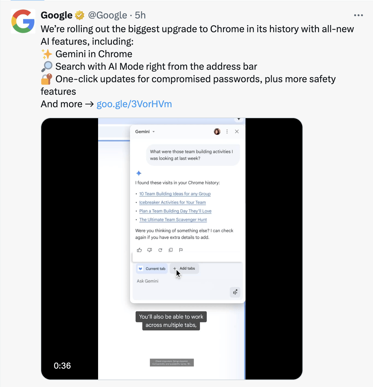 值得一提的是,Gemini 支持跨标签页操作,能够对多个网页内容进行对比与总结。此外,该功能还与 Google 日历、YouTube、地图等应用深度整合,用户可在不离开网页的情况下完成视频定位、会议安排等操作。